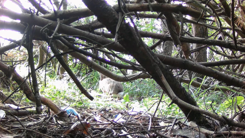 A variety of visitors came by the cameras today. Most were passing through the parking lot and caught by that camera. A few did come down the pee trail too. The couple we caught last month came back again, but they went a little deeper down the trail so we didn’t see any action today. Based on the timestamps, they decided to play a little in the woods again.